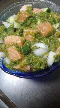 つんままさんの真似っこしようと思ったら、チャンジャが食べ尽くされてたのでこんなの作ってみました~。 きゅうり(ちょっと塩揉み)、新玉ねぎ(水にさらしてから)、サーモン、めかぶ、ゴマ、醤油と胡麻油です! 色々、ゴロゴロしてます(笑)