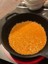 サファリから投稿写真のるかな? フライパンにチーズパラパラして中火で加熱。 プツプツと穴があきはじめた状態のチーズ。 油が出てきたらほぼほぼ完成。 キッチンペーパーに乗せて油切りして冷ませば完成。