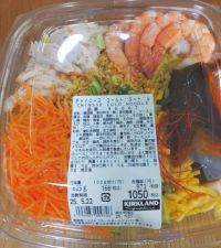 写真がないのですが。 冷やし中華の麺の量的には2人分だと思います。 トッピングの具材はたっぷりです。千切り人参、きゅうり、鶏ハム、エビ、錦糸卵、アーモンド(砕いてちらしてある)タレが普通の冷やし中華のタレではなく、かなりスパシー?異国の味です。個人的には好きな味です。ソースの原材料は、醤油、砂糖、食物油、食酢、にんにく、その他です。このスパイシーさは、その他からくる味なのか。とろみがあり、辛いです。子供の舌には、かなり辛く感じると思います。意外性のあるタレの味でしたが、コストコらしい感じがしました。好きな人にはハマる味です。