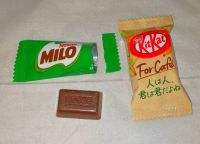 いよいよ中身です。 同じNestléのKitKat for Caféと大きさ比較用に並べてみました。 チョコレート本体は森永ダースを一回り大きくした感じ。中にウェハースやプラリネの入ってない均一なチョコですが、糖分の結晶らしきシャリシャリとした食感があります。 そして明らかなミロ味。 前にミロを子どもが飲みたがらないのでカークランドのチョコチップに溶かして固めて自家製ミロチョコレートを作ったことがあるのですが、大体そんな味です。カークランドのチョコはビターなので、それを更に甘くした感じ。 甘いチョコが苦手だけどミロチョコレートを食べたい人は、カークランドチョコチップに混ぜるといいですよ。 ミロを作って飲むよりチョコレート4個のほうが子どもも喜んで食べるので、手軽でいいかなと思います。 私自身はKitKatのほうが好きですけど。