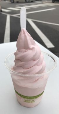 では、ワタクシは【ピーチソフトクリーム】のみの写真を。 北海道ミルクも大好きですが、もも味が負けそうな気がしてピーチのみに。 ほんのりピーチ味ですが、さっぱりと美味しく頂けました(*^^*) 次もピーチのみを選びます。