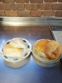 写真ありがとうございます! うわー!こんなに白いんですね! 昨日、白くてペッタンコを購入したつもりですが、写真の2つの間くらいの色です~ ちょっと白すぎて生焼けを心配しちゃいそうな色ですね(^^; 子供たちは「バターの匂いがする~」「マーガリン入ってるやつ?」とか言いながら喜んで食べてました♪ もっと白いの見かけたら、また購入してみたいと思います☆