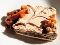 冷凍してみましたが、これはこれでクッキーアイスみたいで美味しくいただけました。 (凍らせた方がチョコ味が感じられるような気もします) ドライフルーツを洋酒に漬けていたものを脇に添えていただきました。