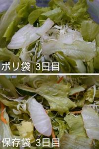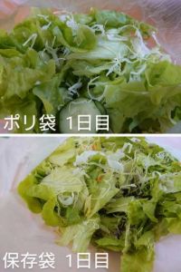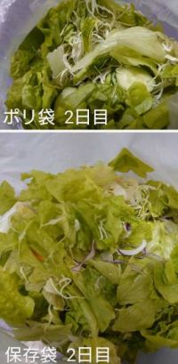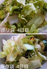 4日目 どちらも冷蔵庫に入れてみましたが、サラダでは顕著な違いは感じられませんでした。 そもそも、この保存袋は野菜や果物をそのまま入れて使うものだと思うので、野菜そのまま入れれば差がつくのかもしれません。