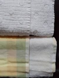 お恥ずかしながら、愛用中の去年版タオルとの比較。 毎回洗濯機で乾燥かけてるせいか、ふた回り位小さくなってました(;゚д゚) 幅で5cm、長さで10cm。。。