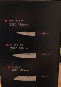 ペティナイフ、シェフナイフ、三徳包丁がセットです。 キッチンバサミは入っていませんでした。