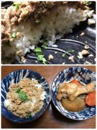 上画像:汚くてすみませんが、さばご飯の断面です。フレークで埋まってる状態が伝われば(^^; 下画像:家族5人で分けた自分の取り分です。5等分より少し少なめとなってます。容器はご飯茶碗大。これで夕食となると貧相に見えますが、プラス1品の具沢山豚汁と追い白米でお腹いっぱいになりましたε-(´∀`; )