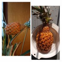 11月に室内に入れてたのですが、気がついたら折れてました!(ノД`)・゜・。 パイナップルは追熟しないとのことなのでしばらくそのままにしてみたのですが 流石に葉や付け焼き刃の細い支柱では支えきれなくなりそうだったので収穫しました。 太陽光の下でもても黄色くなってる!けど、香りは…ほとんどしてません(^_^;) 今晩、カットしてみます〜。(ノД`)・゜・。