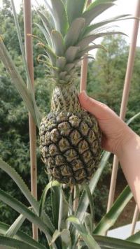 ここまで大きくなりましたが… パイナップルが熟れるのが先か? 冬が来るのが先か? 台風が来る度に移動で葉も私も(トゲで‼️)傷だらけになりました… 久しぶりにコストコでデルモンテパイナップルを2個買ってきたので、解体の合間に~(笑)
