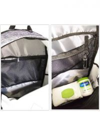 裏です。 肩紐のロゴは刺繍です。 背中の黒い部分のサイズを測ってみたところ… 約50.5cm×29cmでした。