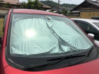 迷いますよね。まるもん家も軽自動車なのでかなーり迷いました!返品覚悟て購入! うちの車は三菱。フロントガラスは80✖️120cm,と軽自動車にしては少し大きめ。 サンシェードサイズ大きいけど、ドキドキ! 実際に使用してみると、写真のように全て隠れていい感じでした! 二つの丸い部分がちょうどいい! これで暑い夏も少しはいいかな? 使わない時は折りたためるので邪魔にならなくてよいですよ。 購入されるときはメジャーで測っていくのが良いですよ。