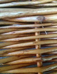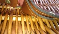 布とカゴは写真のような透明の糸で縫い付けてあります。 あと、木が写真の下のような感じで何ヵ所か割れていたりします。 私はそんなに気にならないのでOKです。