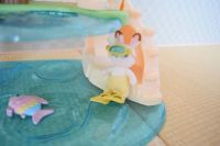 ただしこちら、人形はついてません。ちょっとした小物はついてます!近くのおもちゃ屋さんで人形だけ買いました!水着を着たものがあるようですが、なかったので無難な2体を!笑 パッケージではこのようにぶら下がっていて演出かと思ったら、ちゃんと手と足が引っかけられるようになっていています!これ一番感動しました!