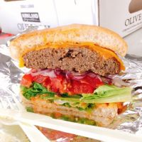 18日に幕張でいただきました\(^o^)/ ちょうどランチタイムだったので、並んでいる間にもチーズバーガーを持っている人達を何人も見かけ、期待が高まりました。 子供と分けようと備え付けのナイフとフォークを使って半分にカット(画像) 半分に切ってもかなり分厚いので、上のバンズからお肉までと玉ねぎから下の野菜とバンズに分けて、ナイフとフォークで食べました。 こちらの感想で、お肉やバンズがパサパサ、ソースが少ない等があったので、どうかと思いましたが、今回いただいたものはそんなことはありませんでした。 バンズは温かく、表面は軽くカリッと焼かれて、お肉は焼き立てではありませんでしたが、ソースの量もほどよい感じ。 4歳の子供は、お肉より上のチーズとバンズにトマトを切って食べさせましたが、予想以上に食べてビックリ! お肉によってはうまく飲み込めないのですが、これは大丈夫で、もっとちょうだいとねだられ、お肉のほぼ半分(バンズとチーズ、トマトも)食べてしまいました。 残りは私が全部美味しくいただきました。野菜たっぷりが好きなので、子供が食べなかった野菜とバンズがあってちょうど良い感じでした( ^ω^ )