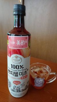 やっと岐阜羽島のロードショーで購入できました。 アイスティーにミチョ桃を入れて桃のフレーバーアイスティーにして飲みました。 お酢が強すぎないので桃の香りがとっても爽やかで暑い夏にぴったりでした。
