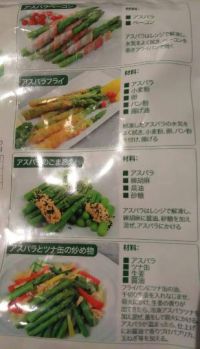 裏にはメニューの紹介も 今回初めて冷凍アスパラガスを購入しましたが 固いと言う事も無く、すじっぽい事も無く、 便利に使う事が出来ました。ブロッコリーが無い無いと探し回らず、今売っている物で利用して野菜が安定するまでは購入してみようと思った商品でした。 冷凍庫内でも平たく保存出来るのが良い!です 購入された方、是非感想をぶら下がりして下さい!