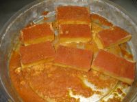 冷凍分をラップで包む前の状態です。カラメルをスプーンでくっ付けて1個ずつ取ってラップの上に。 1番大きいのだけ計量、110gでした。1日限定なら3個食べ切る自信は有ります(笑)。 色味はモニターによる違いも出るでしょうが、少し飛び気味(白っぽく光ってる)。曇りなので自然光撮影が叶いません、実物はもう少し濃くて「ぴよぴっぴ さん」のに近いです。 日が変って「恐ろしい子」の予感がヒシヒシ(苦笑)。冷蔵分を食べきっても冷凍分は暫くお預けかな?
