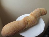 ●ツイストブレッド(Pan Twiste) (以下ポップより) フランスのリムーザン地方のパンです 食欲をそそるきつね色のパン・・・ 手でツイストした特徴的な見た目 小麦サワー種を使い、多くの人に愛されるように仕上げました・・・ 帰宅後、色々測ってみました( ´艸`) 重さ約525g 長さ約45㎝ 幅約8~9㎝ ねじられた不思議な形のパンですね(笑) リムーザンって、フランスのどこ??(;'∀') 気になって調べてみたら、フランスの中南部。 陶磁器のリモージュ、と聞いてご存知の方もいらっしゃるかもしれませんね。 さくらんぼのクラフティ―はリムーザン地方が発祥なのだそう。 切ってみるとクラム(中)は白く、もっちりとした食感のシンプルなパン。 試食で出されていた時に、食べた皆さんが口々に「美味しい」「そのままで美味しい」と言われてたのが印象的でした。 フランスの粉は美味しいので、粉の旨味を感じるパン、シンプルにそのままずーっと食べてしまいそうです^m^