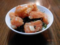 ぐるんサマにぶら下がらせて頂きます。 4/5(水)多摩境で『ハワイアンサーモンポキ』のみ購入してきました。 加工年月日:17年4月5日、消費期限:17年4月5日。 【名称:惣菜 原材料名:サーモン(ノルウェー産)、玉ねぎ、ごま油、ポキシーズニング(食塩、白ごま、ローストアーモンド、デキストリン、赤ピーマン、唐辛子、植物油) この製品は卵、乳、小麦、えび、かにを使用した設備で製造しています。】 と、裏面のシールに書かれていました。 羽島のミーハー主婦さまの『次回はごはんに韓国海苔と一緒に載せて食べたい』コメントを拝見して、それは絶対美味しい食べ方だ!! と一足お先に真似っこ(?)させて頂きました。 コストコで買った『栃木芳賀産コシヒカリ』に、コストコで買った『韓国海苔フレーク』を載せて、その上に今日コストコで買った『サーモンポキ』を載せて。 コストコ尽くしの美味しい一膳でした。 料理&アレンジの上手な方は、コストコの『アトランティックサーモン』を使って、同じような物が作れるのかもしれませんが。 買うしかない私は美味しく頂きました♪
