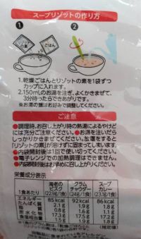 3種類の粉末スープと、乾燥ごはんは共通。 しゃもじの裏に取り残されてカピカピになったご飯のような状態ですが、お湯を注ぐとスーッと水分吸収してふんわりご飯の状態になります。